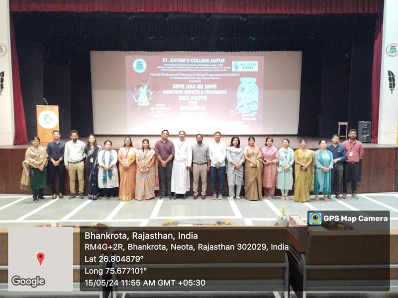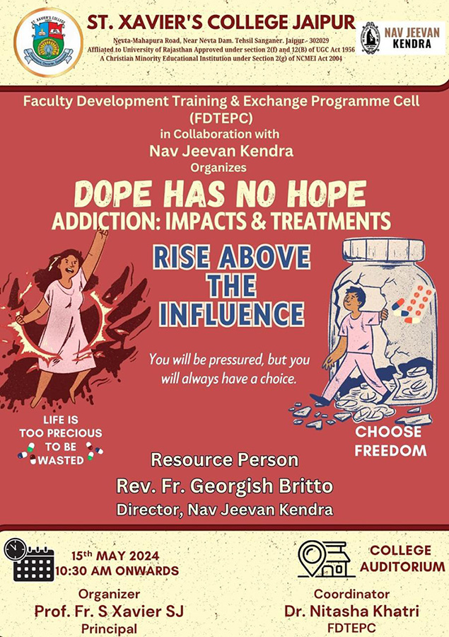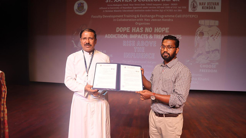Rev. Fr. Georgish Britto, Director of Nav Jeevan Kendra, conducted an awareness programme on “Addiction: Impacts & Treatment” at St. Xavier’s College, Jaipur. He delivered an interactive presentation on the impacts of addiction. This event was organized by the Faculty Development Training & Exchange Programme Cell in collaboration with Nav Jeevan Kendra.
